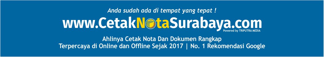 CetakNotaSurabaya.com merupakan percetakan nota Surabaya , spesialis cetak nota murah dan aneka dokumen rangkap, juga salah satu domain percetakan surabaya  atau printing Surabaya yang didirikan tahun 2017 dibawah naungan Triputra Media, percetakan online Surabaya berpengalaman yang berfokus pada percetakan di Surabaya untuk produk kertas. Percetakan murah Surabaya, cetak nota satuan di Surabaya